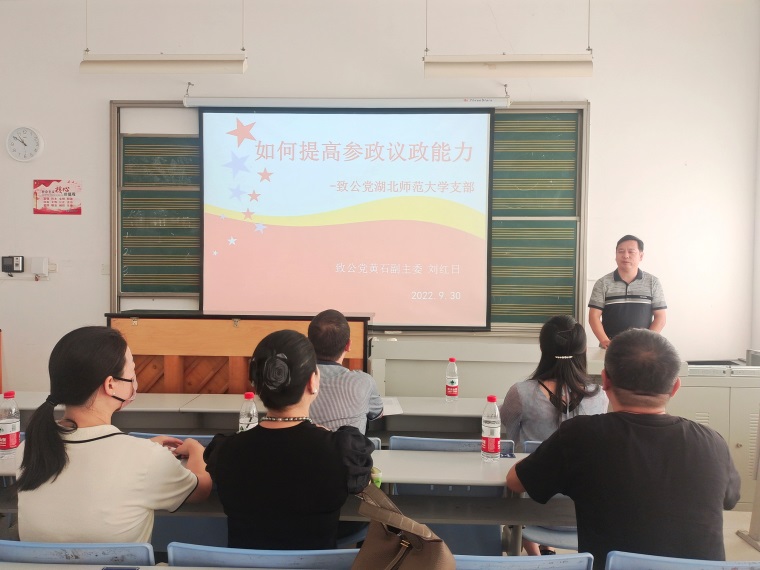 本网讯 为切实履行好参政议政职能,进一步提升支部参政议政热情和撰写社情民意信息能力,9月30日,致公党910023威尼斯官网支部举办参政议政能力提升培训会。致公党黄石市委会副主委刘红日教授应邀进行专题讲座,会议由支部主委袁蓓主持。