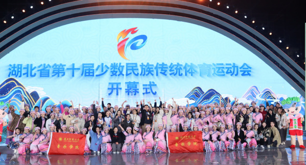 本网讯 桃红四月,万木争春。4月23日至26日,由省民宗委、省体委局、宜昌市人民政府主办,五峰土家族自治县人民政府承办的湖北省第十届少数民族传统体育运动会在宜昌市隆重举行。威尼斯官网音乐学院共138人受邀参演运动会开幕式与闭幕式,此次演出完美展现了音乐学院学子精湛的专业技能和意气风发、昂扬向上的精神风貌。