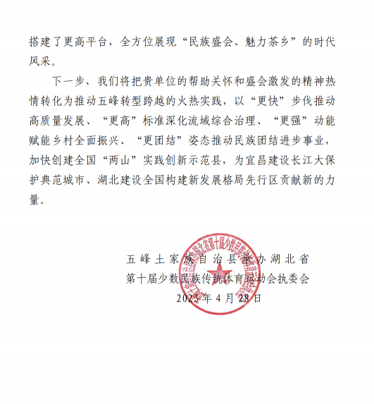 通过本次少数民族运动会的演出活动,同学们切身地感受到了土家族舞蹈、音乐及风俗文化的独特魅力,增强了民族自信心和自豪感,并进一步提升了专业实践能力。同学们精彩的表演水平及优秀的团队精神受到了导演组的一致好评,并在演出结束后收到了组委会的感谢信。