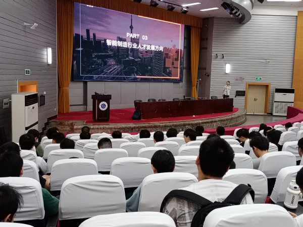 授牌仪式结束后,为进一步帮助学生了解当前行业特点和人才需求情况,王笛笛在教育大楼报告厅以“争当智能时代的掌舵人——智能制造行业前瞻与行业人才需求”为题进行了一场公益讲座,电气工程及其自动化学院20级全体学生、21级及22级部分班级学生等近500人聆听讲座。