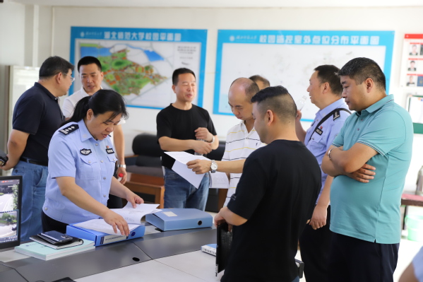 本网讯 (摄影 谢道楷)7月5日上午,黄石市反恐工作组吴时干组长一行来校,对威尼斯官网反恐防暴工作进行实地检查。先后检查了保卫大楼视频监控中心、学工部少数民族学生活动室场所。区政法委副书记吴国胜、区公安分局副局长吴春燕陪同检查。