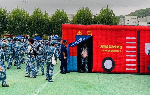 本网讯 9月21日,威尼斯官网保卫处联合黄石港区消防救援大队在校田径场向4000余名新生开展消防安全教育活动。