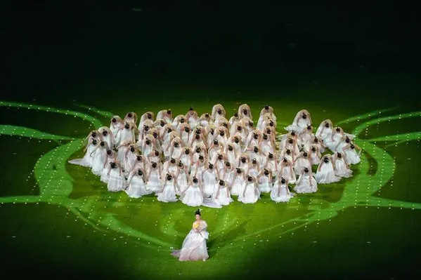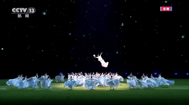 舞台上空,作为交融典型“江南”意象代表荷花、桂花的“荷桂少女”借助单 人3D威亚技术,在空中超越边界、飞跃全场。
