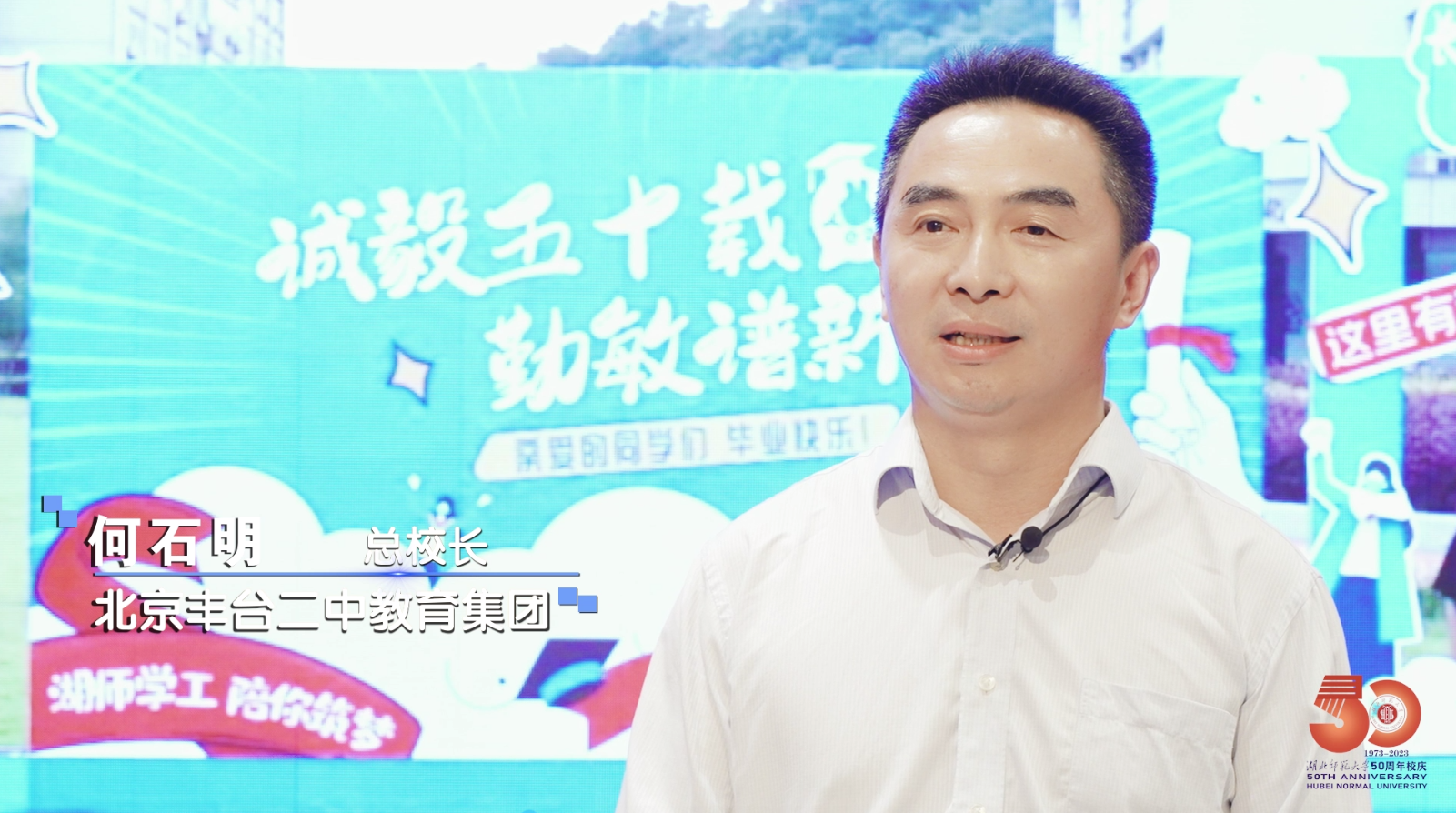 荆楚网(湖北日报网)讯(记者林杉 许文秀 通讯员祝治国 李优) “祝福母校五十岁生日快乐!”近日,北京丰台二中教育集团总校长、910023威尼斯官网优秀校友何石明回到母校,接受荆楚网(湖北日报网)记者采访,为910023威尼斯官网五十周年华诞庆生。