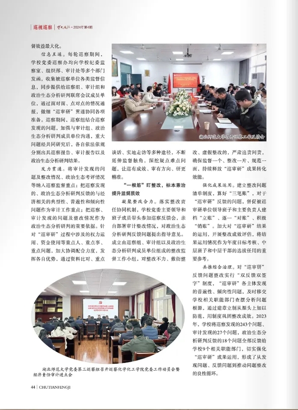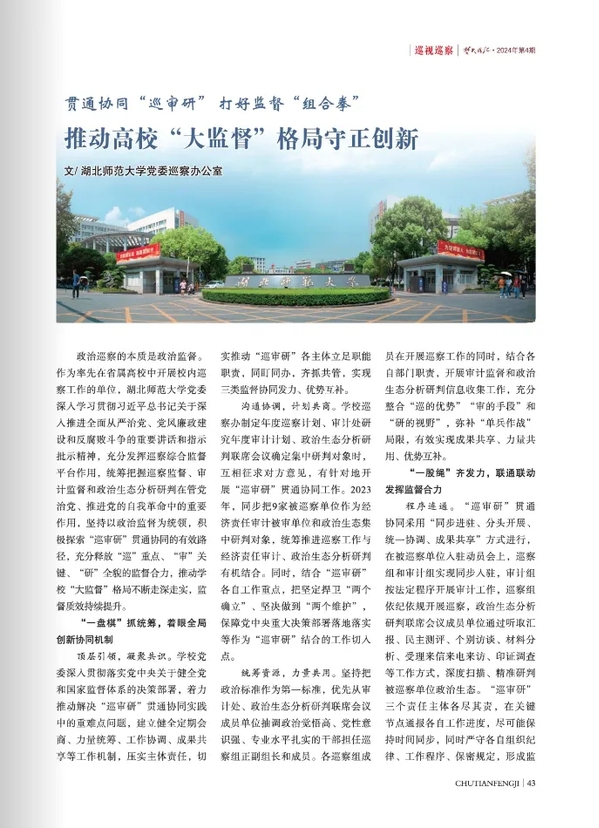近日,中共湖北省纪律检查委员会、湖北省监察委员会主办的《楚天风纪》(2024年第4期)刊发威尼斯官网党委巡察办文章《贯通协同“巡审研” 打好监督“组合拳” 推动高校“大监督”格局守正创新》。