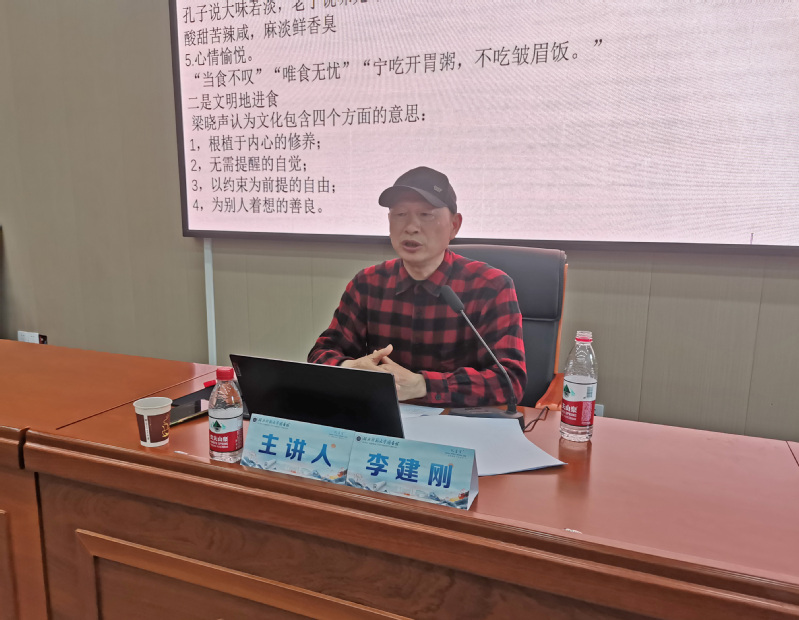 讲座中,李建刚介绍了中华4个饮食板块(塞北、淮河以北、岭南、长江流域)和11个饮食文化区存在主食不同、口味不同、风格不同的情况,相同的是注重品位、讲究美感、四季有别、食医结合,在饮食观念上追求“天人合一”,在饮食结构上追求均衡协调,在饮食理论上注重“食医合一”。李建刚从“吃什么、怎么吃、为什么这样吃”三个方面,详细讲解了各地有名的菜肴、食材加工的方法、饮食文化内涵等。他谈到,要科学进食,做到定时定量、注意卫生、营养均衡、口味清淡、心情愉悦;要文明进食,遵守公德,讲究礼仪,展现良好修养。