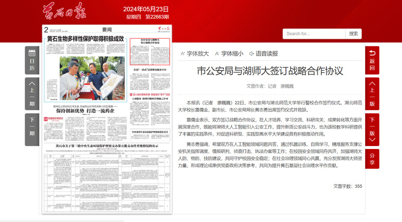 黄志勇强调,希望双方在人工智能领域同题共答,通过机器训练、自我学习,精准服务支撑公安机关指挥调度、情报研判、侦查打击、执法办案等工作;在校园安全领域同舟共济,加强湖师大人防、物防、技防建设,共同守护校园安全稳定;在社会治理领域同心共赢,充分发挥湖师大师资力量,形成理论成果供党委政府决策参考,共同为提升黄石基层社会治理水平作贡献。(记者 廖巍巍)