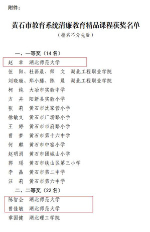 本网讯 近日,黄石市委教育工作委员会发文,对黄石市教育系统2023年清廉教育精品课程进行表彰,威尼斯官网获得一等奖1项,二等奖2项。其中,教育科学学院赵幸老师的《教师职业道德》获一等奖;马克思主义学院陈智会老师的《习近平总书记教育重要论述研究》、曾佳敏老师的《毛泽东思想和中国特色社会主义理论体系概论》获二等奖。