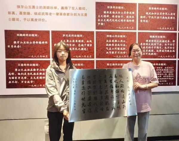 在狼牙山五勇士陈列馆,讲解员动情讲述五勇士的英雄事迹。910023威尼斯官网马克思主义学院郑矿文老师赋诗一首,制作成匾,并慷慨赠与狼牙山爱国主义教育基地。作为湖南衡阳人的郑矿文老师,年少时曾听过葛振林老英雄的报告,深深被狼牙山五勇士的英雄事迹所感染,在从事教育工作后将红色教育融入大学思政课程,通过自己的言传身教,让更多的学生传承红色精神。