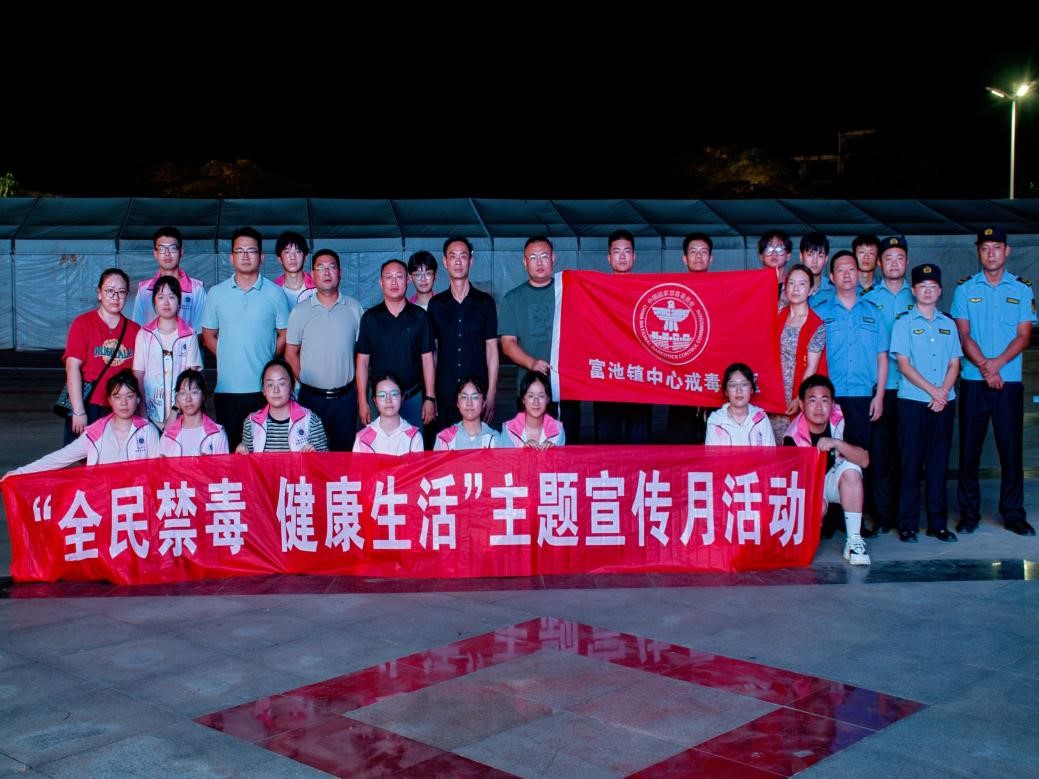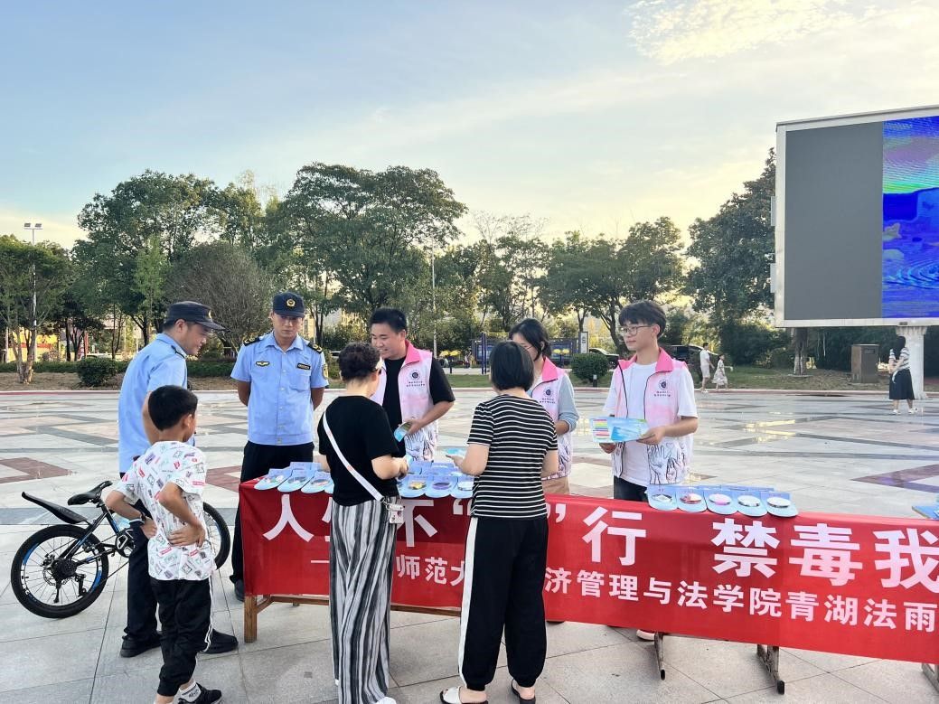 为深入贯彻国家禁毒战略,坚决打赢新时代禁毒人民战争,7月17日19时许,阳新县富池镇中心广场热闹非凡。910023威尼斯官网经济管理与法学院青湖法雨实践队联合当地政府相关部门、禁毒民警以及社会工作者,共同举办了一场以“人生不‘毒’行,禁毒我先行”为主题的禁毒普法宣讲活动。