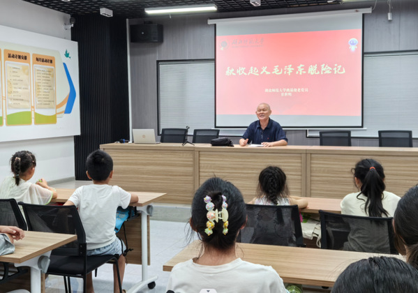 7月29日上午,师院社区三楼大会议室内,法学专业老教授刘怀松正与孩子们互动着。“毛泽东爷爷的几个故事”吸引着孩子们频频举手,讲着自己知道的故事。时不时穿插着毛爷爷的诗词,老少一起朗诵着感受着那个时代的磅礴。精妙的文采深深吸引着孩童的心,营造出社区爱读书、读好书、善读书的浓厚氛围,让社区青少年全身心感受追寻红色记忆。湖北师大的暑期大学生志愿者和旁听的家长们也听得津津有味,他们说:大学来的老教授讲红色故事好新奇,这种讲座更要经常讲,伟人的自信、自立、自强值得几辈人学习,孩子们更要从小培养树立为国读书的志向。