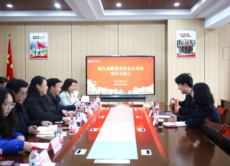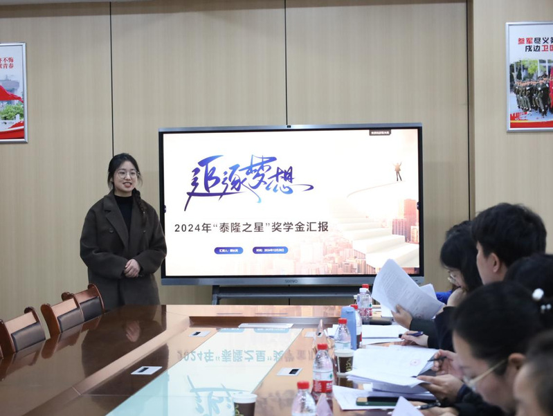 本网讯 2024年12月26日下午,浙江泰隆慈善基金会来校项目交流会暨“泰隆之星”奖学金评审会在学校一站式社区总站举行。浙江泰隆慈善基金会项目部代表郭佳浩、志愿单位湖北大冶泰隆村镇银行人力资源部代表叶雯雯,校学生工作部、人民武装部、招生与就业处、国际交流合作处、校友工作处、经济管理与法学院、外国语学院、音乐舞蹈学院负责人参加项目交流会。会议由学生工作部副部长熊英主持。