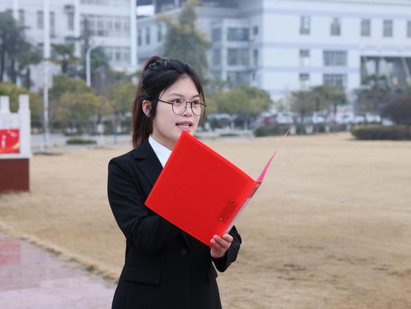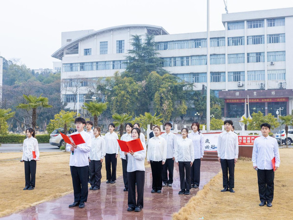随后,学生代表祝凡婷进行国旗下的演讲,她以青年学子的使命,鼓励同学们青衿怀壮志,以信仰破桎梏;履践启新程,以热血铸脊梁;乾坤作序,以青春赴山海。她号召同学们牢记青年学生使命,将个人理想追求融入国家繁荣和民族复兴的伟大事业中,为社会主义现代化强国建设贡献力量。紧接着,同学们带来的配乐朗诵《苍松劲立山河卷,荆楚砚墨启新章》,展现湖师学子昂扬向上、锐意进取的精神风貌。