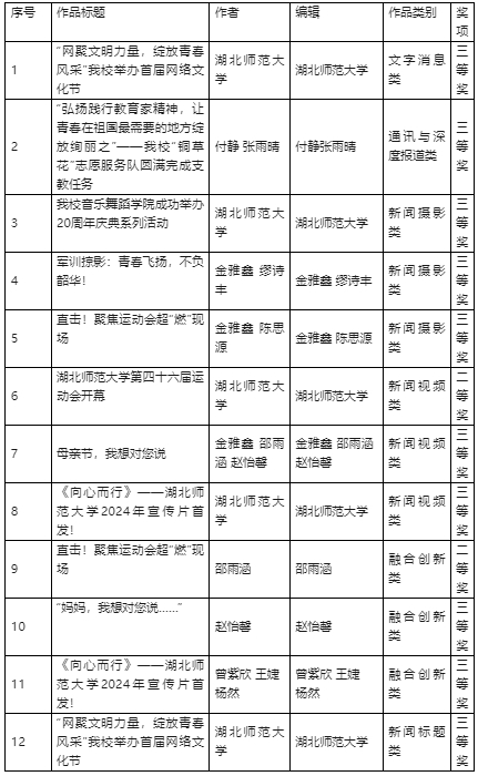湖北高校新闻奖是湖北省高校优秀新闻作品最高奖,由湖北省高校新闻协会主办。2024年度湖北高校新闻奖设消息类、通讯与深度报道类、言论类、新闻摄影类、版面类、媒体融合类,全省高校千余件作品参加评选。在910023威尼斯官网党委宣传部的指导与支持下,学校学生通讯社(简称“学通社”)充分展现出了学校学生宣传队伍的专业风采,共斩获12项奖项,其中二等奖2项、三等奖10项,获奖数量实现了新的突破。现将获奖名单公布如下: