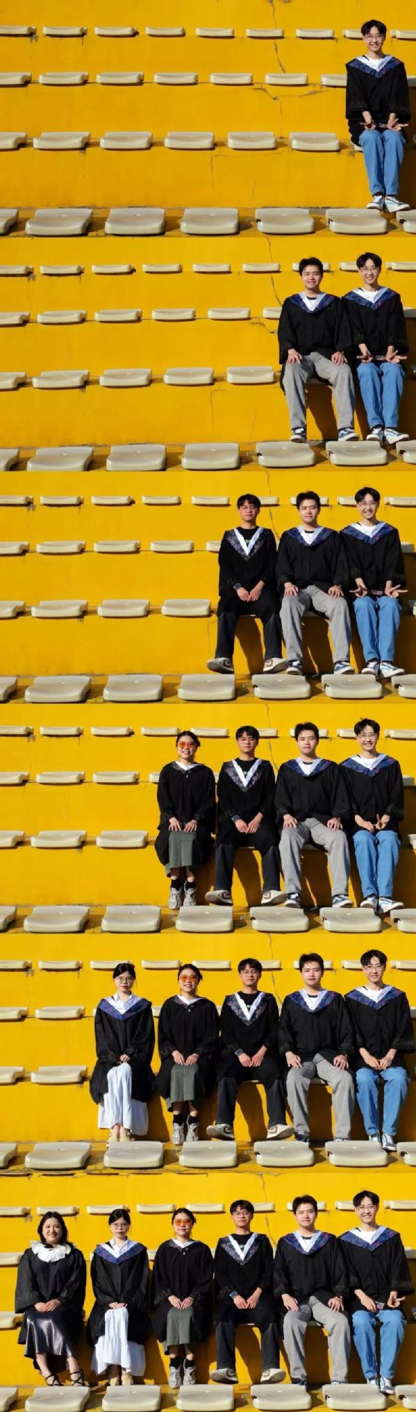 天台之上,他们排成一排,高高抛起学士帽,身影在天光下凝成剪影。有人蹦跳、有人伸展手臂,每一个姿态都满是青春的肆意。帽儿飞旋的瞬间,毕业的喜悦与对未来的憧憬一同迸发,我按下快门,把这热烈又珍贵的画面留存,见证他们与校园时光郑重的告别。