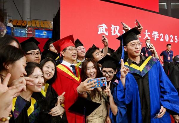 6月21日,华中农业大学2025年“异曲同工”毕业巡游活动如约而至。同学们踏着欢快的音乐沿着樱花路行进,一路载歌载舞,不时驻足与道路两旁的师生家长互动。青春洋溢的舞蹈引得围观者纷纷拿出手机记录这美好的瞬间。图为工学院队伍中“工小蓝”和“工小粉”两位人形机器在机车前领航。