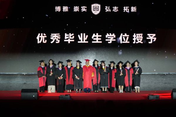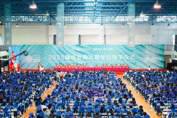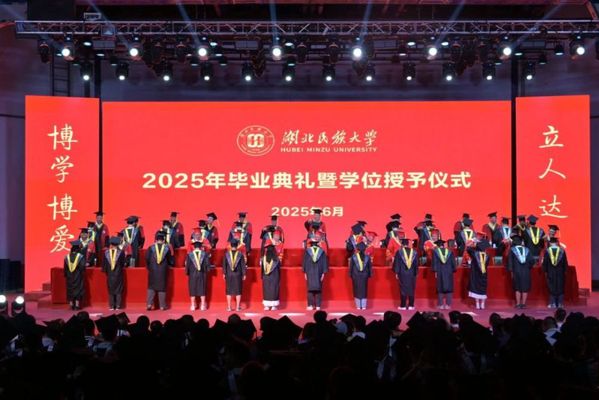 在湖北民族大学 2025 年毕业典礼暨学位授予仪式现场,红墙、校训与青春身影交织成难忘的画面。舞台上,毕业生们身着学士服,与导师们并肩而立,“博学博爱 立人达人” 的校训在两侧熠熠生辉,见证着数年求学的成长蜕变。