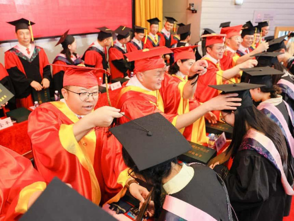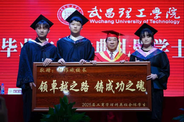 6月20日,武昌理工学院2025届毕业典礼上,工商管理精英班毕业生赠送刻有 “领卓越之路,铸成功之魂” 的牌匾,寄托传承母校精神的信念。