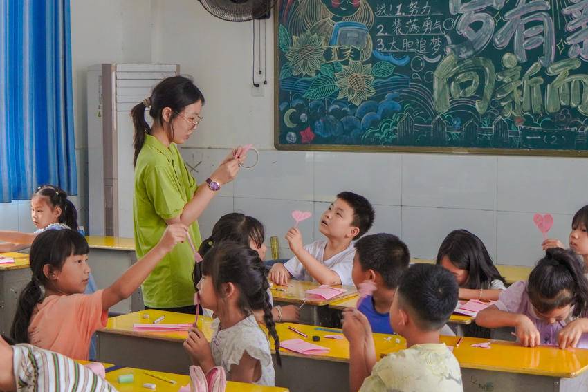 “小燕子”实践队立足自身专业优势,开设音乐鉴赏,舞蹈,手工,体育等特色艺术课程,从而丰富乡村学生暑假生活,令其感受艺术的魅力。手工课上,彩纸在指尖上流转成花,成鸟,巧思在剪刀开合间绽放,实践队员帮助他们将灵感变为现实,播撒下一个个艺术启蒙的种子。
