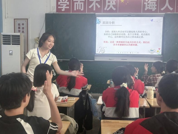 支教老师覃思湘讲授题为“生为玫瑰无惧荆棘——反对校园霸凌”的心理健康课