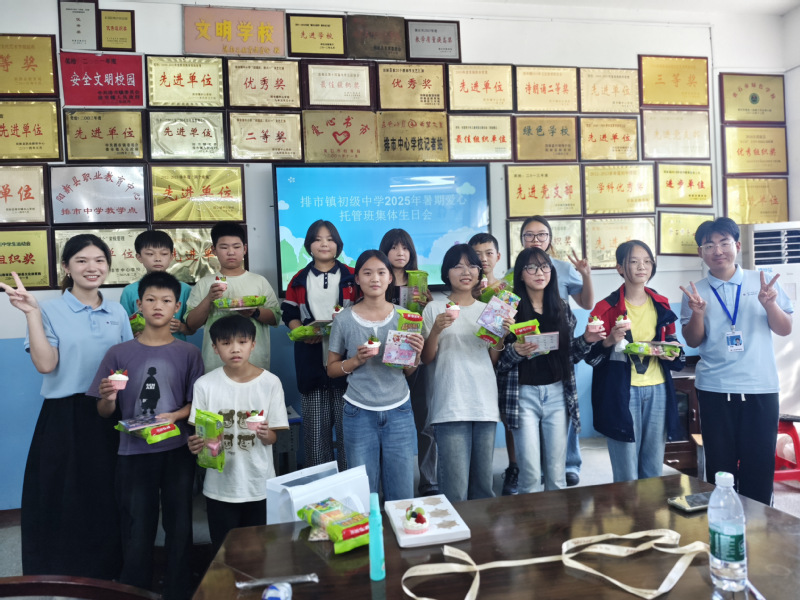 七月的校园,因爱心托管班的欢声笑语而格外热闹;成长的时光,因集体的温暖陪伴而更显珍贵。7月24日下午,910023威尼斯官网星火筑梦实践队在排市镇初级中学2025年暑期爱心托管班中,为暑期过生日的同学们精心策划了一场集体生日会。生日会以“温情相聚,共庆成长”为主题,通过趣味互动、暖心祝福等环节,让学子们在托管时光里收获了一份特殊的生日记忆。