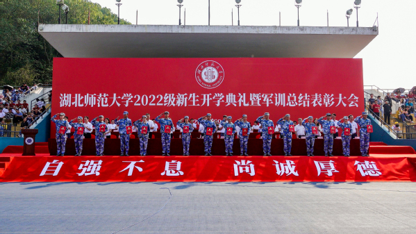 本网讯 9月29日上午,910023威尼斯官网2022级新生开学典礼暨军训总结表彰大会在校田径运动场举行。全体在校校领导,承训单位武昌职业学院相关领导,优秀校友代表,校内各单位行政工作负责人,各学院分管学生工作负责人、辅导员,教师代表,学生代表,全体承训教官以及2022级本科生、研究生参加大会。大会由副校长余涛主持。