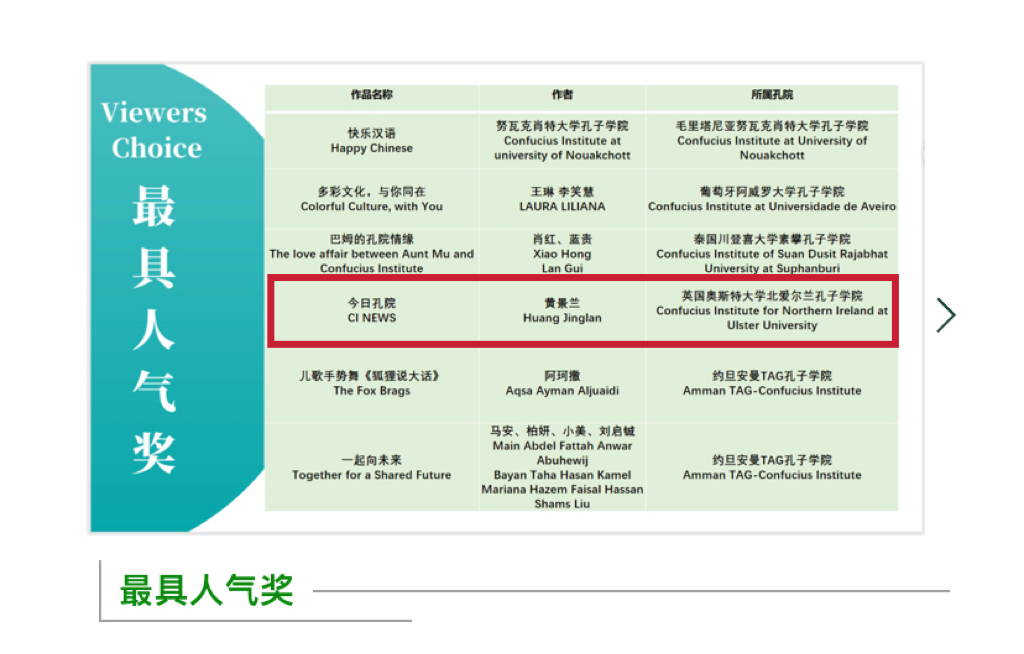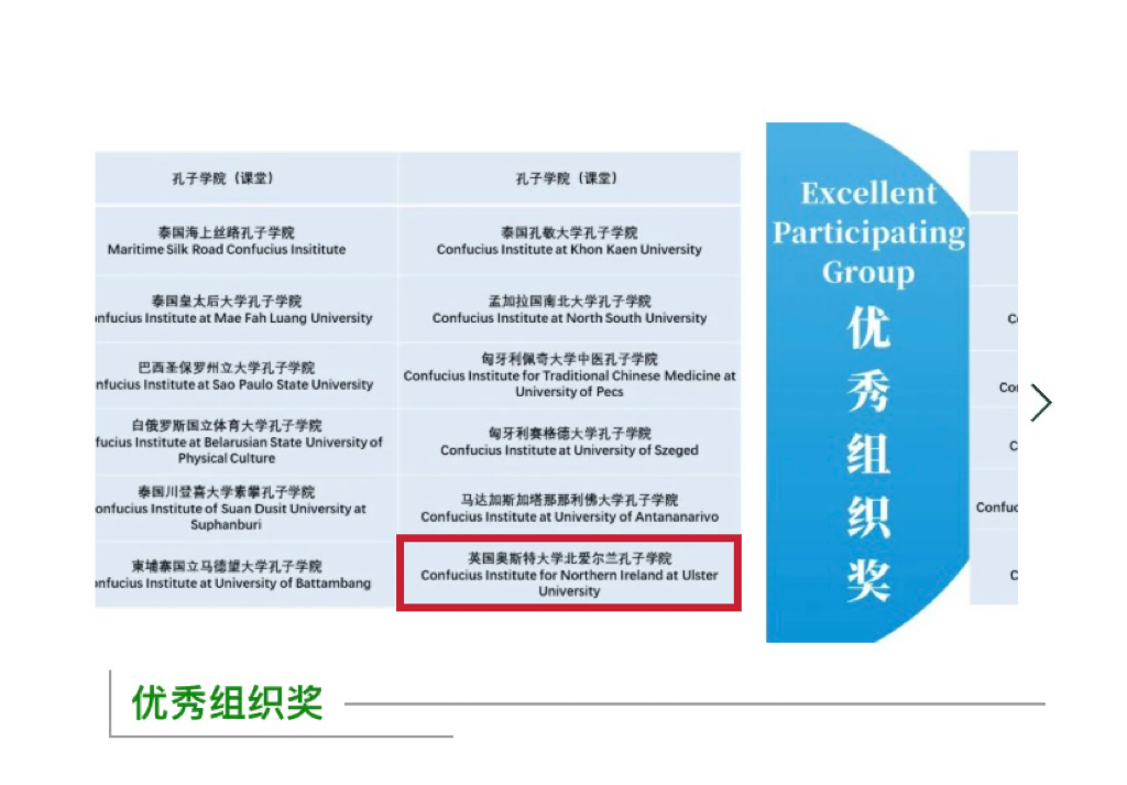黄景兰老师在视频中分享了自己与孔院结缘的故事和心路历程,她在获奖感言中谈到,这个奖项不仅仅属于个人,也属于奥斯特大学北爱尔兰孔子学院,属于910023威尼斯官网,属于在孔子学院辛勤工作的每一位汉语教师们: