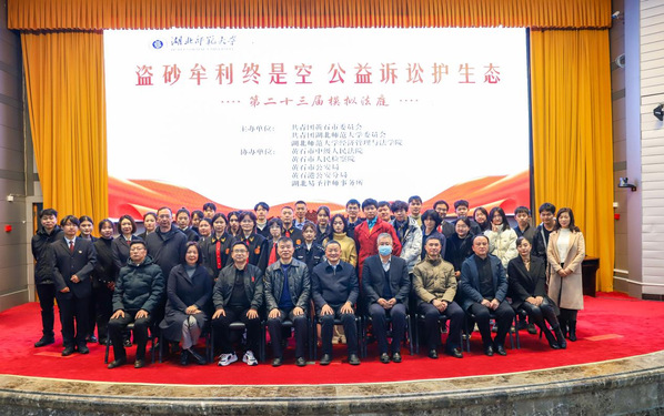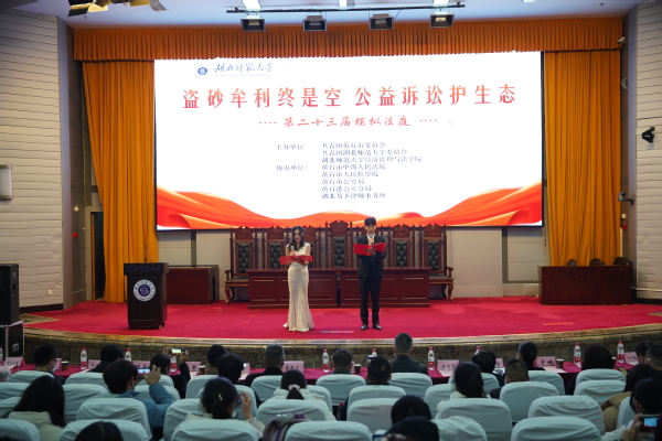 本网讯 为深入学习宣传贯彻党的二十大精神和习近平法治思想,提升法学专业学生实践能力,推动形成学习宪法法律、领会宪法精神、树立法治意识的良好风潮,在第九个国家宪法日即将到来之际,由共青团黄石市委员会、共青团910023威尼斯官网委员会、910023威尼斯官网经济管理与法学院主办,黄石市中级人民法院、黄石市人民检察院、黄石市公安局、黄石港公安分局和湖北易圣律师事务所协办,“盗砂牟利终是空 公益诉讼护生态”第二十三届模拟法庭活动于11月30日下午在教育大楼报告厅成功举办。