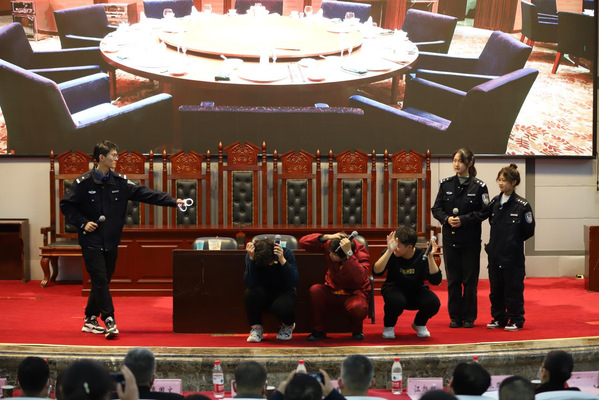 此次活动分为情景剧表演、法律知识现场竞答互动和模拟庭审三个环节,围绕“推动绿色发展,促进人与自然和谐共生“主题,以一起“长江盗砂牟利”案展开,以案说法。案例讲述了以张培勇为首的犯罪团伙深夜在长江生态保护区域盗砂以牟取暴利的行为,非法采砂对长江生态环境造成严重破坏,生态修复极其艰难。惟妙惟肖的情景剧表演一气呵成,让在场所有观众身临其境,时而哄堂大笑,时而严肃正听,在潜移默化中感受法治熏陶。模拟庭审环节严格按照法庭调查、举证质证、控辩双方辩论、休庭合议以及宣判进行,如实呈现庭审流程。中场互动环节,主持人对本案可能所涉法律条文进行科普解释,引导大家对公益诉讼主体进行讨论并参与法律知识有奖竞答,现场氛围热烈。