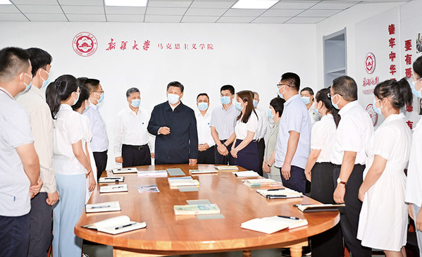 2022712日至15日,中共中央总书记、国家主席、中央军委主席习近平在新疆考察。这是12日下午,习近平在新疆大学铸牢中华民族共同体意识研究基地,同师生亲切交流。新华社记者 李学仁/