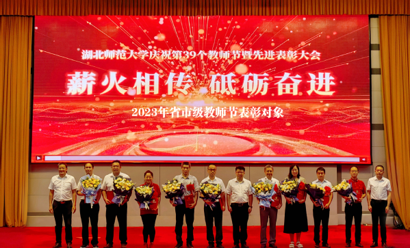 本网讯 为深入学习贯彻党的二十大精神和习近平新时代中国特色社会主义思想,充分展现新时代高质量教师队伍建设的突出成就和广大教师立德树人、自信自强的精神风貌,努力造就一支师德高尚、业务精湛、结构合理、充满活力的高素质专业化教师队伍。9月7日下午,在第39个教师节即将来临之际,学校召开了师德师风建设动员会暨庆祝第三十九个教师节先进表彰大会。全体校领导、企业嘉宾中国建设银行黄石分行行长段琼玺、副行长胡俊峰、校直各单位党政负责人、2023年各类获奖教师、2023年新入职教师以及各学院师生代表欢聚一堂,共同感受属于人民教师的无上荣光。大会由党委常委、统战部部长肖六亿主持。