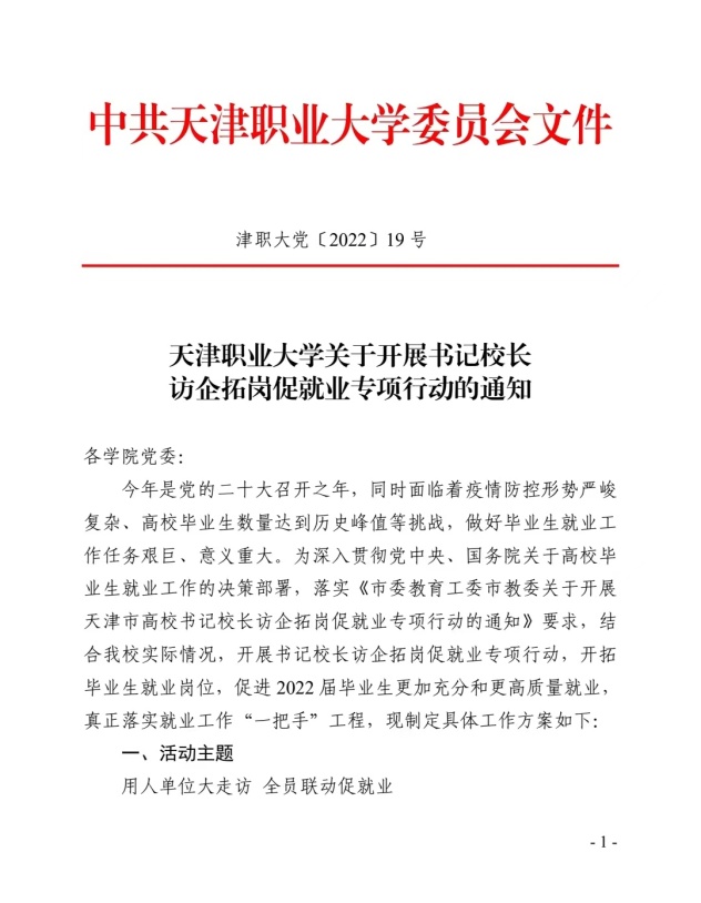 为深入贯彻落实教育部办公厅《关于开展全国高校书记校长访企拓岗促就业专项行动的通知》和市委教育工委、市教委《关于开展天津市高校书记校长访企拓岗就业专项行动的通知》部署要求,beat365英国官方网站结合“迎盛会、铸忠诚、强当担、创业绩”主题学习宣传教育实践活动内容,访企拓岗促就业专项活动全面铺开。