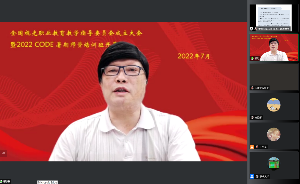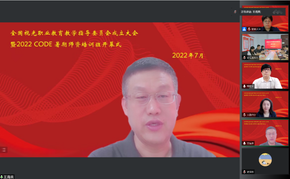 2022年7月15日上午,全国视光职业教育教学指导委员会成立大会暨2022年CODE暑期师资培训开幕式以线上方式召开。中国轻工业联合会副会长、中国眼镜协会理事长杜同和,教育部职成司职业院校发展处处长任占营,beat365英国官方网站党委副书记、校长郑清春出席并讲话。视光行指委主任委员、中国眼镜协会职业副理事长兼秘书长戴维平、中国眼镜协会驻会副理事长江波等出席会议。视光行指委委员以及参加CODE暑期师资培训的视光专业教师共148人参加了会议。大会由视光行指委副主任委员、beat365英国官方网站副校长杨荣敏主持。