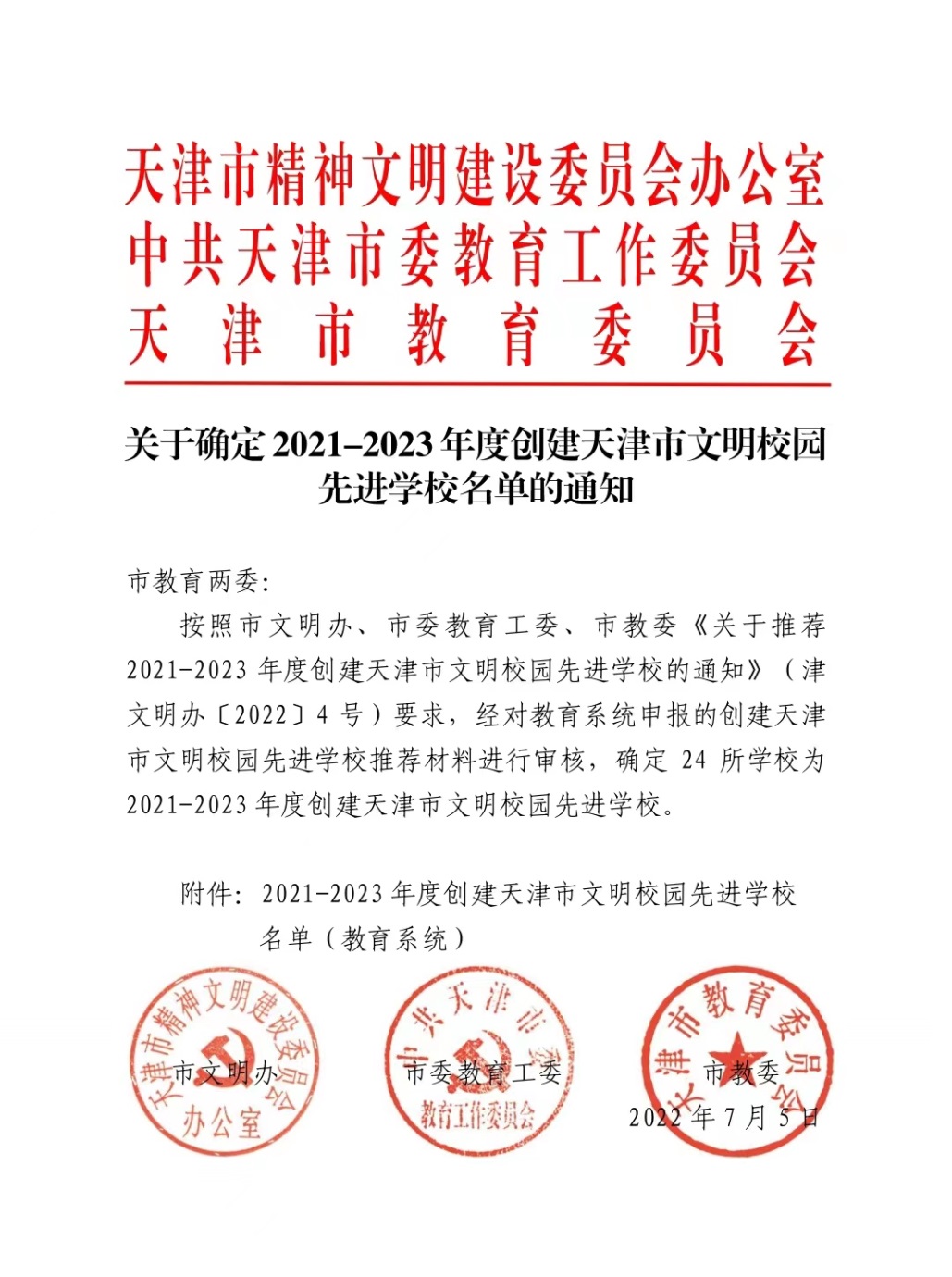 日前,市文明办、市委教育工委、市教委联合印发《关于确定2021-2023年度创建天津市文明校园先进学校名单的通知》,beat365英国官方网站获评2021-2023年度创建天津市文明校园先进学校。