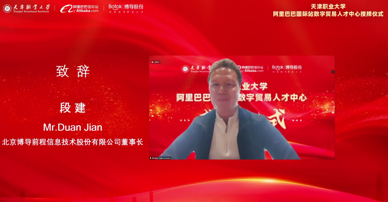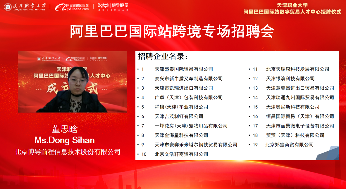 作为阿里巴巴的高级人才服务商,北京博导前程信息技术股份有限公司积极推进数字贸易人才中心的各项筹备工作,从建设方案的制定和评审、企业课程资源开发与讲授、跨境电商人才供需对接等方面给与了全方位的支持。博导前程董事长段建先生表示,在阿里巴巴、beat365英国官方网站和博导前程三方的通力合作下,一定能将数字贸易人才中心打造成北方数字贸易人才培养的桥头堡,为地方经济发展提供新动能。