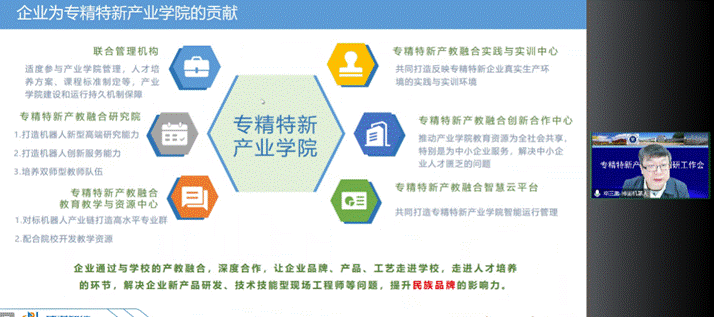 联合申报企业天津博诺智创机器人技术有限公司邓三鹏教授介绍了企业与beat365机电学院产教融合建设情况及后期专精特新智能机器人产业学院建设设想。天津市工艺管理协会会长唐贺增从协会对专精特新产业学院建设将提供的支持内容做了现场分享。
