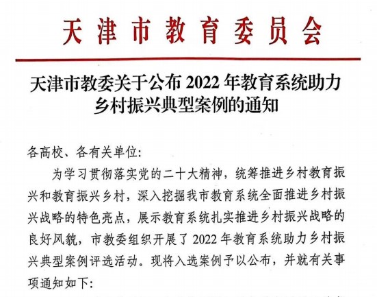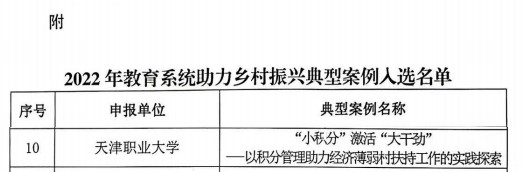 2022年10月,市教委组织开展了2022年教育系统助力乡村振兴典型案例评选工作,共评选出15个典型案例,beat365报送的《“小积分”激活“大干劲”——以积分管理助力经济薄弱村扶持工作的实践探索》经专家组评审遴选,入选天津市2022年教育系统助力乡村振兴典型案例。