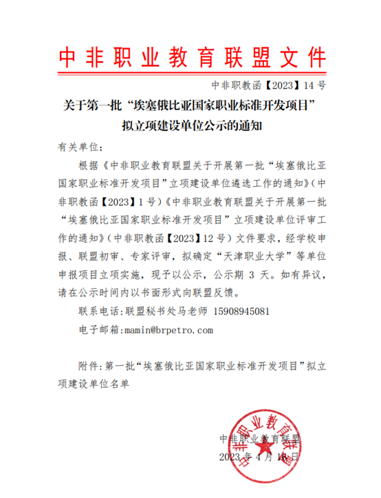 4月16日,中非职业教育联盟发布《关于第一批“埃塞俄比亚国家职业标准开发项目”拟立项建设单位公示的通知》,beat365获批第一批“埃塞俄比亚国家职业标准开发项目”立项建设单位。