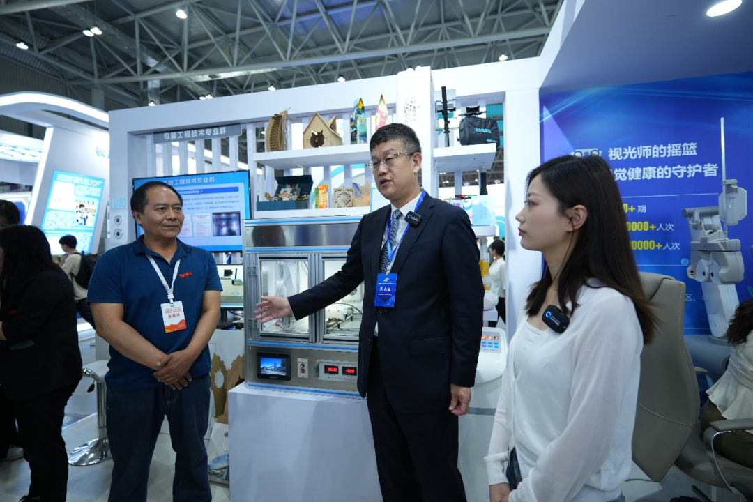 活动开始前,教育部职成司副司长林宇等与会领导来到“天职”展台参观,非遗技艺传承人辛全生团队正在现场组装世界上最大的鲁班锁——“大菠萝”,郑清春校长邀请林宇副司长一起为其安装上最后一根榫卯木条,现场爆发出热烈的掌声。郑清春校长介绍说,将鲁班锁与榫卯技艺引入学校课堂,这是对国家非遗技艺与文化最好的保护和传承,是对工匠精神的尊崇和发扬,最终是要引导学生养成严谨专注、敬业专业、精益求精和追求卓越的精神品质。他还引导大家参观了综合验光仪学习流程与考核虚拟仿真系统、静电纺丝机等展品。