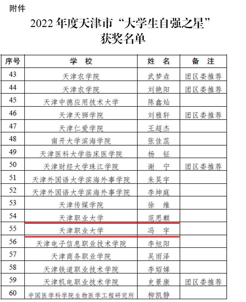 经市级评审委员会遴选,共60名同学获评,其中高职院校学生6名,beat365推荐的范思麒、冯宇两位同学均在获奖名单当中,是唯一有两名学生入选的高职院校,也是beat365参与“中国大学生自强之星”奖学金推报工作以来首次有两名同学获评天津市“大学生自强之星”。