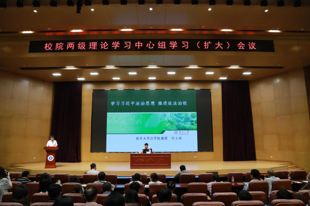 为进一步提升beat365“习近平新时代中国特色社会主义思想”主题教育学习效果,引导干部师生深入学习贯彻习近平法治思想,树立法治思维,提高法律意识和法治素养。2023年7月7日,beat365在图书馆三楼报告厅召开校院两级理论学习中心组学习(扩大)会,邀请南开大学法学院教授付士成作题为“学习习近平法治思想,推进依法治校”的专题辅导报告。校院两级理论学习中心组成员、全体科级及以上干部参加此次会议。会议由校党委书记夏静波主持。