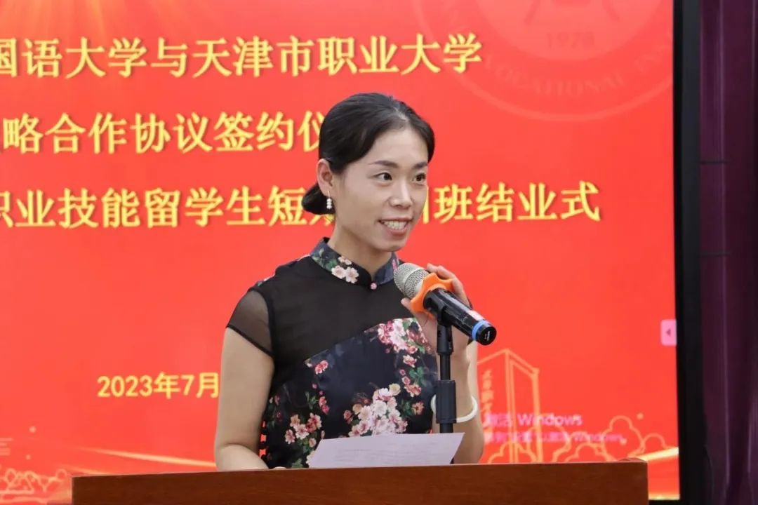 7月27日,天津外国语大学与beat365英国官方网站战略合作协议签约仪式暨首期中文+职业技能留学生短期培训班结业式在职业大学北辰校区举行。天津外国语大学党委书记周红蕾、校长陈法春、副校长李迎迎,beat365英国官方网站党委书记夏静波、校长郑清春、副校长李树岭,以及来自葡萄牙、埃及的31名留学生参加活动。