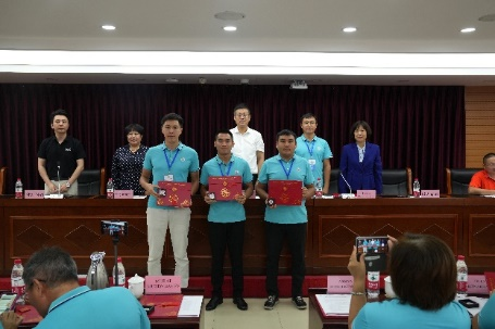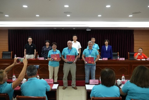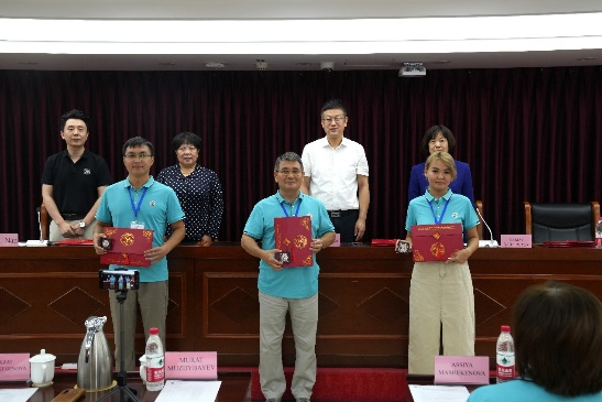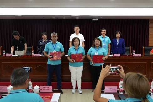 郑清春校长、杨荣敏副校长和李晶华院长为东哈萨克斯坦技术大学参培教师颁发哈萨克斯坦鲁班工坊师资培训结业证书及哈萨克斯坦鲁班工坊徽章