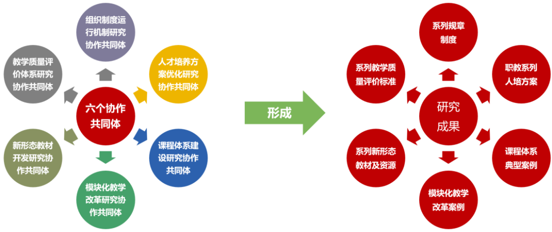 课题组按照 《国家职业教育改革实施方案》中组建高水平、结构化教师教学创新团队的要求,依托飞书任务协作平台组成多个 “微共同体”,即若干基于专业领域价值认同的聚优共研校际共同体、基于模块教学需要的教学共同体(主要为校内专兼教师组合)和基于创新发展融合共生的校企共同体。beat365英国官方网站统筹规划、科学管理、系统推进七个研究任务,包括:创新团队协作共同体建设、创新团队建设的组织制度和运行机制、人才培养方案、对接职业标准的课程体系、团队协作的模块化教学模式和方法新形态教材开发、创新团队教学质量评价体系。