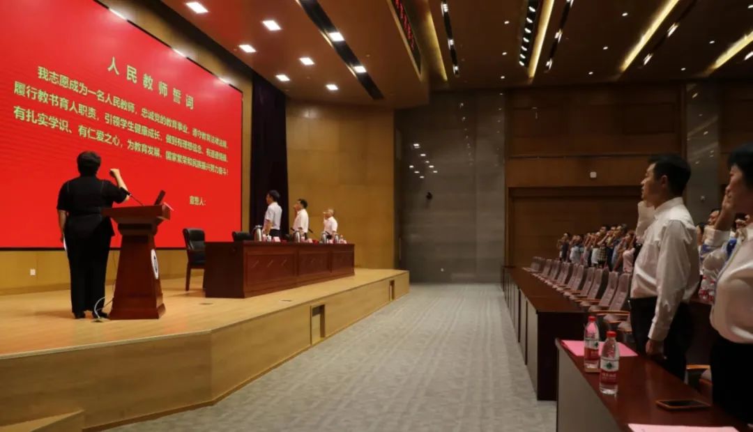 表彰大会在雄壮的国歌声中正式拉开帷幕。杨荣敏副校长带领全体教师重温人民教师誓词:我志愿成为一名人民教师……掷地有声的誓词,是每位教师“为党育人、为国育才”的政治坚守,“育德育能,力实力新”的教育情怀,更是“躬耕教坛,强国有我”的志向与抱负。