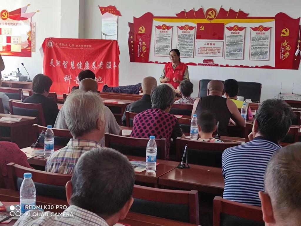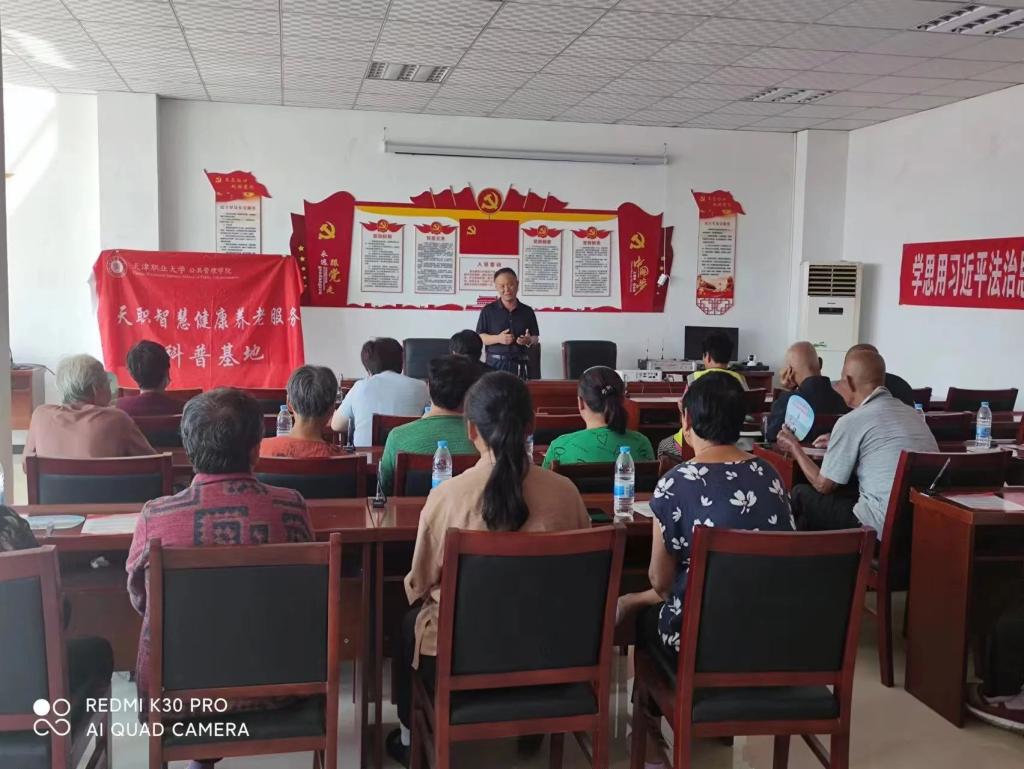 正值2023年天津市全国科普日活动期间,天职智慧健康养老服务科普基地积极贯彻落实习近平总书记给中国农业大学科技小院学生重要回信精神,探索在乡村一线开展培训和群众性科普文化活动等形式,基地于2023年9月14日,由beat365英国官方网站公共管理学院副书记带队,组织专职科普宣讲员前往天津市宝坻区朝霞街道小刘庄村开展普法科普服务进社区活动。小刘庄村是天津市法治建设示范村,致力于用实际行动为讲好中国式农业农村现代化故事添砖加瓦。