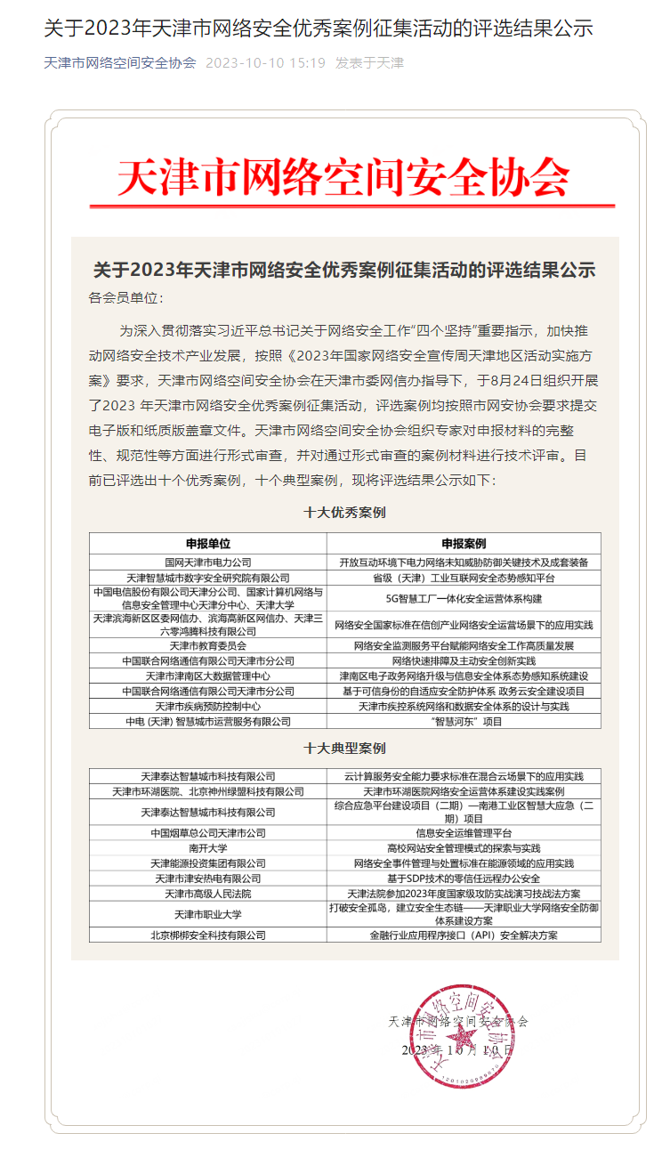 近日,2023年天津市网络安全优秀案例征集活动评选结果公布,beat365报送的《打破安全孤岛,建立安全生态链——beat365英国官方网站网络安全防御体系建设方案》获评十大典型案例。