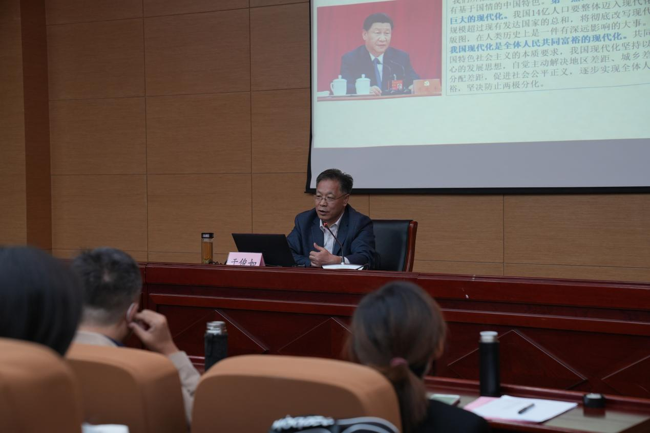 于教授从回顾中国共产党带领中国人民探索现代化道路的艰辛历程出发,从重要特征、本质要求及重大意义等方面深入阐述了“中国式现代化”的历史逻辑、理论逻辑及实践逻辑,带领师生精准把握“以中国式现代化全面推进中华民族伟大复兴”的深刻意义。于教授指出,中国式现代化的鲜明特色在于人口规模巨大、全体人民共同富裕、物质文明和精神文明相协调、人与自然和谐共生以及走和平发展道路,而这些特色既是中国式现代化的重要特征,也是其显著优势。于教授强调,“中国式现代化”理论是习近平新时代中国特色社会主义思想的重要组成部分,“中国式现代化”道路是强国建设、民族复兴的康庄大道,也是唯一正确道路,“中国式现代化”事业是探索性和开创性的事业,需要我们以顽强斗争去打开事业发展新天地。