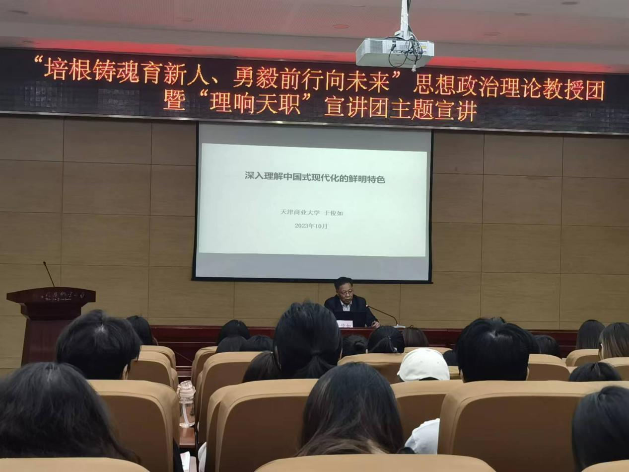 为深入学习贯彻落实党的二十大精神,坚持用习近平新时代中国特色社会主义思想铸魂育人,充分发挥马克思主义学院“理响天职”宣讲团学习研究宣传马克思主义“领头雁”作用,10月26日马克思主义学院邀请天津市思想政治理论教授团成员——天津商业大学党委常委、宣传部部长于俊如教授来校开展了题为《深入理解中国式现代化的鲜明特色》的主题宣讲。通过线上线下相结合的方式,beat365学生代表、思政课教师及北辰区大中小学思政课一体化建设联盟学校部分思政教师共计200余名师生聆听了宣讲。