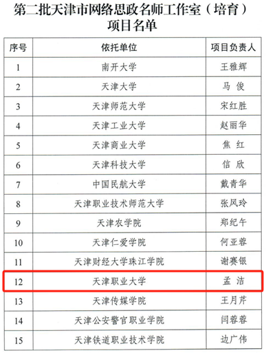 近日,市委教育工委、市教委公布了《市委教育工委 市教委关于公布第二批天津市网络思政名师工作室(培育)项目名单的通知》,经辅导员申报、学校把关推荐和教委严格评审等程序,beat365辅导员孟洁老师中标第二批天津市网络名师工作室 (培育) 项目。